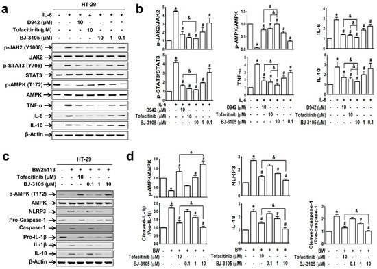 BJ-3105 blocked IL-6- or E. coli BW25113-induced AMPK inhibition and upregulations of cytokines and inflammasome better than tofacitinib in HT-29 cells. (a,b) Immunoblots (a) and quantitation (b) of IL-6-induced phosphorylation of JAK, STAT, and AMPK, and expressions of inflammatory cytokines. * p < 0.05, versus the vehicle-treated control group. #p < 0.05, versus the IL-6-treated group. &p < 0.05, versus the tofacitinib-treated group. (c,d) HT-29 cells were prereated with BJ-3105 or tofacitinib for 1 h prior to commensal bacteria (E. coli strain BW25113) for 3 h. After HT-29 cells were washed three times with PBS to remove non-adhering E. coli, the cells were used for immunoblotting. Immunoblots (c) of AMPK and inflammasome components, and their quantitation (d). Results are presented as the means ± SEMs of at least three independent experiments. *p < 0.05, versus the vehicle-treated control group. #p < 0.05, versus the BW25113-treated group. &p < 0.05, versus the tofacitinib-treated group.