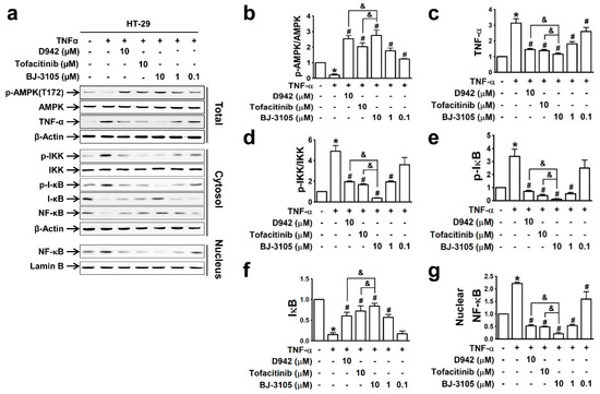 Inhibitory effects of BJ-3105, tofacitinib and D-942 on TNF-α-induced changes in the phosphorylation of AMPK, IKK, I-κB, and nuclear translocation of NF-κB in HT-29 cells. Immunoblots (a) and quantitation of expression levels of AMPK (b), TNF-α (c), p-IKK (d), p-I-κB (e), I-κB (f) and nuclear NF-κB (g). *p < 0.05, versus the vehicle-treated control group. #p < 0.05, versus the TNF-α-treated group. & p < 0.05, versus the tofacitinib-treated group.