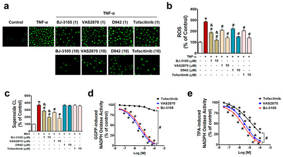 Inhibitory effects of BJ-3105, tofacitinib, D-942, and VAS2870 on TNF-α-, mevalonate, GGPP-, or TPA-induced ROS and NOX activities in HT-29 cells. (a,b) TNF-α-induced ROS levels in serum-starved HT-29 cells were measured by detecting DCF fluorescence using fluorescent microscopy (a) and microfluorometry (b). (c) Superoxide radical production was measured using a lucigenin chemiluminescence assay. (d,e) NOX activity was measured using lucigenin in cell extracts and GGPP (d) or TPA (e) as a stimulator. Results are presented as the means ± SEMs of three independent experiments. *p < 0.05, versus vehicle-treated controls. #p < 0.05, versus stimulator (TNF-α, mevalonate, GGPP, or TPA)-treated cells. &p < 0.05, versus tofacitinib- or VAS2870-treated cells.