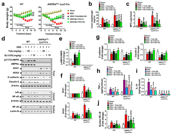 BJ-3105 was more effective than tofacitinib at ameliorating DSS-induced colitis in mice. (a–c) Inhibitory effects of tofacitinib and BJ-3105 on DSS-induced colitis in WT and AMPKαfl/fl-Lyz2-Cre mice were evaluated by measuring body weights (a), colon weight/unit length (b), and MPO level in colon tissues (c). (d–g) The effects of tofacitinib and BJ-3105 on gene expression levels in total protein, cytosolic, and nuclear extracts of colon tissues were determined by immunoblotting (d). Densitometry was used to assess p-AMPK/AMPK (e), NOX1/2 (f), and epithelial junction molecules, and E-cadherin and claudin-2 levels (g). (h,i) TNF-α (h) and IL-10 (i) levels in colon tissues were determined by ELISA. (j) Densitometry results of nuclear levels of NF-κB (j). *p < 0.05, versus sham-operated WT controls. #p < 0.05, versus DSS-treated WT mice. $p < 0.05, versus sham-operated AMPKαfl/fl-Lyz2-Cre mice. &p < 0.05, versus DSS-treated AMPKαfl/fl-Lyz2-Cre mice. §p < 0.05, versus tofacitinib-treated WT or AMPKα KO mice.