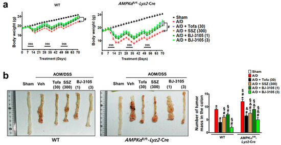 We further investigated whether the anti-colitis efficacy of BJ-3105 extended to the inhibition of tumor formation caused by AOM pretreatment and chronic DSS treatment. At the end of the experiment after nine weeks of DSS and drug treatments, body weights were significantly decreased, and the decrease was more severe in AMPKαfl/fl-Lyz2-Cre mice than in WT mice (Figure 7a). In the colon tissues, many tumors were developed in WT and AMPKαfl/fl-Lyz2-Cre mice, but higher numbers of tumor were found in AMPKαfl/fl-Lyz2-Cre mice (Figure 7b). In addition to recovering body weights, BJ-3105 and tofacitinib also significantly suppressed AOM/DSS-induced tumor formation (Figure 7b). Furthermore, the recovery effect of BJ-3105 (3 mg/kg) was greater than that of tofacitinib (30 mg/kg), and much superior to that of sulfasalazine, a mild acting anti-colitis drug.