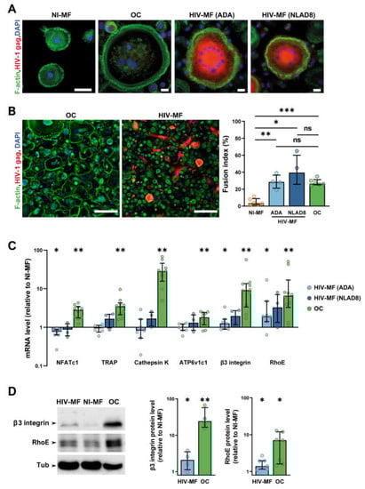 HIV-1 infection induces macrophage (MF) fusion and the expression of some osteoclast (OC) markers. MF were infected or not with HIV-1 (indicated strains), and compared to autologous OC for cell fusion (A,B) and expression of different OC markers (C,D). (A) Representative immunofluorescence (IF) images of uninfected MF (NI-MF), MF infected with HIV-1 (HIV-MF, ADA, or NLAD8 strain), and OC after staining for HIV-1 gag (red), F-actin (green), and nuclei (DAPI, blue). Scale bar, 10 µm. (B) Left panels: Representative large IF images of HIV-MF (ADA strain) and OC after staining for F-actin (green), HIV-1 gag (red), and nuclei (DAPI, blue). Scale bar, 200 µm. Right panel: Quantification of the fusion index evaluated by IF, corresponding to the percentage of nuclei within multinucleated cells. Histograms represent median and error bars are interquartile range, n = 4 to 6 donors, 300 cells analyzed per donor and per condition. (C) mRNA expression of genes overexpressed in OC measured by RT-PCR using the ΔΔCT method in HIV-MF (ADA or NLAD8 strain) and in OC. Actin mRNA level was used as control. Values are normalized to mRNA level in autologous uninfected MF. Histograms represent median and error bars are interquartile range, n = 4 to 10 donors. (D) NI-MF, HIV-MF (NLAD8 strain), and OC lysates were subjected to Western blot using antibodies against β3-integrin, RhoE, and α-Tubulin as loading control. A representative blot (left panel) and quantification of the protein level ratio over autologous NI-MF (right panel) are shown. Histograms represent median and error bars are interquartile range, n = 4 to 7 donors. * p ≤ 0.05; ** p ≤ 0.01; *** p ≤ 0.001, ns: not significantly different.