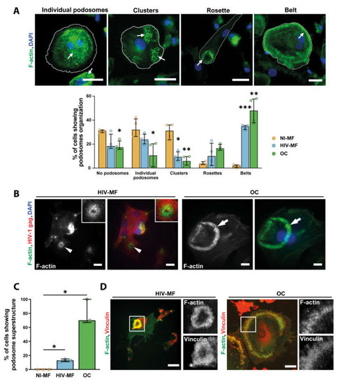 Thus, HIV-1-infected MF forms F-actin structures sharing common characteristics with the OC sealing zone, even if their number and size are lower.