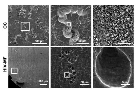 As the formation of sealing zone is instrumental for osteolytic activity, we explored the capacity of HIV-1-infected MF to degrade the bone matrix. The bone resorption area observed for MF (close to 1% of the total bone surface) did not significantly increase upon HIV-infection (Figure S3A,B), while it reached 15% for OC differentiated from the same donors. This parameter correlated with a low concentration of the C-terminal telopeptide of type 1 collagen (CTX) released in the supernatants of uninfected and infected MF, compared to the one obtained in OC supernatants which was around 50-fold higher (Figure S3C). The morphology of resorption lacunae was examined by scanning electron microscopy (SEM). As expected, OC formed long and large bone degradation trails [14,25,43] (Figure 3, upper panels). In the case of infected MF, we observed in some experiments (3 donors out of 5) the rare appearance of individual round resorption pits referred to short trails (Figure 3, lower panels); this degradation profile was never observed for uninfected MF. High magnification of the degraded pits showed superficial abrasion of bone microstructure in the case of infected MF compared to deep excavations with high porosity in the case of OC.