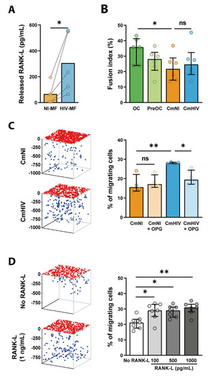 In conclusion, CmHIV is not sufficient to promote differentiation of OC precursors in vitro, but it promotes their 3D mesenchymal migration, in particular through RANK-L secretion, suggesting that HIV-1-infected MF could exert a bystander effect to favor active recruitment of OC precursors to bones.
