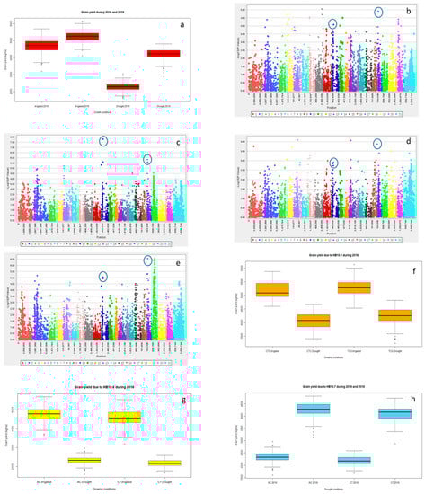 Boxplot indicating variation for grain yield under irrigated and drought conditions for the years 2016 and 2018 (a); marker trait association using GLM for irrigated (b) and drought (c) conditions 2016, and irrigated (d) and drought (e) conditions 2018. HB 10.1 showing differences in grain yield under irrigated and drought condition for 2018 (f), HB 10.6 showing differences in grain yield for irrigated and drought conditions in 2016 (g) and HB 10.7 showing differences for grain yield for drought conditions for 2016 and 2018 (h).
