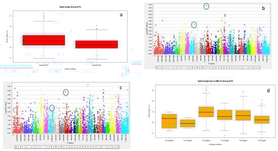 Boxplot showing variation for spike length under irrigated and drought condition for the year 2018 (a); marker trait association through GLM under irrigated (b) and drought (c) condition 2018, HB 6.10 showing differences in spike length (d).