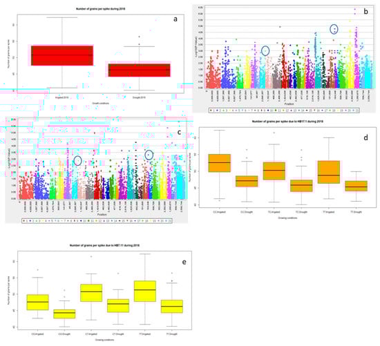 Boxplot showing variation in number of grains spike-1 under irrigated and drought conditions for 2018 (a); marker trait association through GLM under irrigated 2018 (b) and drought (c) conditions 2018. HB 17.1 showing differences in number of grains spike−1 (d) and HB 7.11 showing differences in number of grains spike−1 (e).