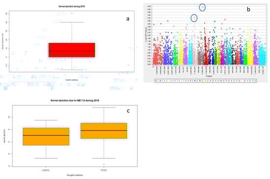 Boxplot showing variation in kernel abortion under drought during 2018 (a). marker trait association through GLM under drought 2018 (b) and haplotype block (HB) 7.12 showing differences in kernel abortion (c).