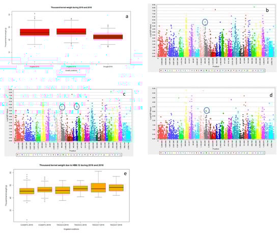 Boxplot showing variation for thousand kernel weight under irrigated conditions 2016 and irrigated and drought condition for 2018 (a). marker trait association through GLM under irrigated 2016 (b), irrigated 2018 (c) and drought (d) conditions 2018. HB 8.12 showing differences in thousand kernel weight under irrigated conditions for 2016 and 2018 (e).