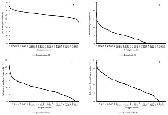 Graphs showing average reduction of different traits in 339 genotypes for grain yield (a), spike length (b), number of grains spike−1 (c), and thousand kernel weight (d).