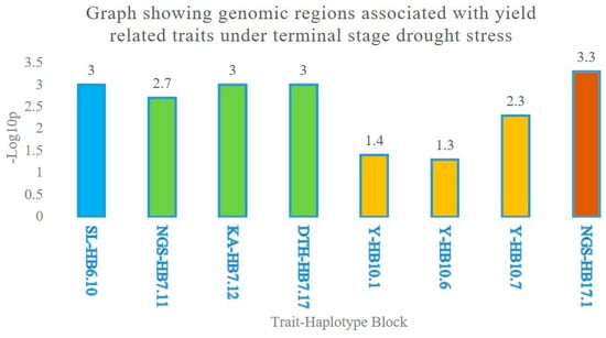 Genomic regions were identified in the haplotype block trait analysis. Two adjacent HBs on chromosome 3A, HB7.11, and HB7.12 were found to be significantly associated with NGS and KA, respectively. Similarly, three HBs, HB10.1, HB10.6, and HB10.7 were found to be associated with Y under a terminal stage drought stress though with a low significance level (Table 3 and Figure 7)