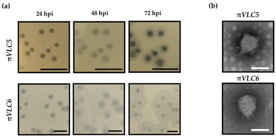 Phage πVLC5 was obtained from a water sample in an irrigation ditch near a wastewater treatment plant, whereas phage πVLC6 was isolated from a river, near its outflow to the sea, in an area where waste discharged by nearby villages accumulates. Our initial screening was carried out using a multidrug-resistant clinical isolate of K. pneumoniae as host, which belongs to capsular type K22. Once plaques were observed, they were further isolated and plaque-purified. Amplification of the phages in liquid medium was carried out to obtain a high-titer lysate and to proceed with detailed phage characterization. Plaque assays showed that the amplified phage πVLC5 reached a titer of 2.4 × 1011 plaque forming units (PFU) per mL, while πVLC6 reached 1.0 × 1010 PFU/mL. For both phages, large plaques were observed, which were surrounded by a halo that is often interpreted as an indicator of depolymerase-mediated digestion of bacterial capsules (Figure 1a). Haloes are formed because depolymerases can diffuse and degrade capsules in nearby bacteria even if lysis does not occur in these areas. This has been previously shown in other Klebsiella spp. [] and in phages infecting other encapsulated bacteria, such as Escherichia coli or Acinetobacter baumannii [,]. The haloes of phage πVLC6 were wider than those of πVLC5, whereas lysed areas were larger for πVLC5, suggesting that these were two distinct phages. Transmission electron microscopy micrographs obtained from high-titer lysates showed that the virion morphology of the two phages was similar and typical of podoviruses, with an icosahedral head of approximately 50 nm and a small tail of about 10 nm (Figure 1b).