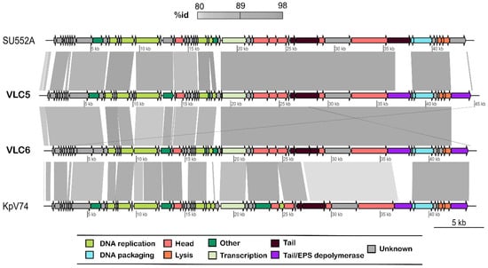 Genome alignment of the Klebsiella phages πVLC5 and πVLC6 with the previously characterized Klebsiella phages vB_KpnP_SU552A (closest relative) and vB_KpnP_KpV74. Arrows represent coding sequences (CDSs). The different shades of gray represent different identity levels. The figure was obtained using genoPlotR [].