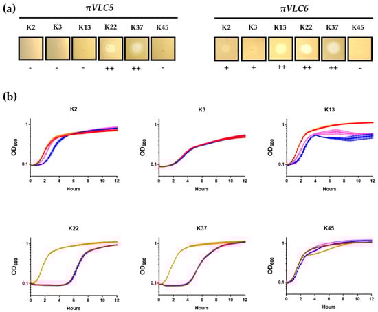 Lytic activity of Klebsiella phages πVLC5 and πVLC6 in different capsular types. (a) Spot tests of the two K. pneumoniae phages in K2, K3, K13, K22, K37, and K45 Klebsiella sp. reference strains. All 77 reference strains were assayed, but only those showing phage activity are shown, except for K45, which is included as an example of a non-susceptible strain. Plaques were allowed to develop in soft agar media overnight at 37 °C. ++: obvious lysis; +: halo-like turbidity reduction; -: no effect. (b) OD measurements of capsular types K2, K3, K13, K22, K37, and K45 Klebsiella spp. Orange—non-infected control; red—πVLC5; blue—πVLC6; pink—πVLC5 + πVLC6. Error bars indicate the SEM.