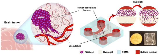 The low survival rate in patients diagnosed with GBM in comparison with other cancer types is known to be due to its high malignancy, heterogeneity, and invasive behavior [3,18,55]. This situation does not leave enough time for clinical studies to thoroughly understand the patient-specific physiological behavior of GBM, and more importantly, perform systematic clinical trials for personalized drug development. Animal tests are typically costly and time consuming, with a relatively low relevance to human GBM [56]. In vitro tests also have been limited to monolayer cell culture plates, which fail to mimic the physiological condition of the disease in vivo, resulting in the unrealistic response of the cells to the chemotherapy agents [25,57]. Especially, the analysis of parameters such as the invasiveness or morphological conditions of the tumor cells has been highly limited due to the lack of a 3D structure with the presence of an extracellular matrix (ECM) [58]. Such limitations have resulted in the lack of a proper therapy procedure, and consequently a low survival rate for the patients.
