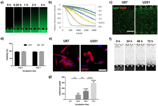 The functionality of the cells in the tumor model was evaluated by the expression of the glial fibrillary acidic protein (GFAP) receptor, a specific marker for astrocytes and glioma cells [41,42]. The U251 and U87 cells in the tumor model were immunostained with GFAP after 72 h of incubation and imaged by confocal microscopy (Figure 2e). Both the U251 and U87 cells showed a positive GFAP expression, demonstrating the astrocyte phenotype of the cells used in our GoC model.
