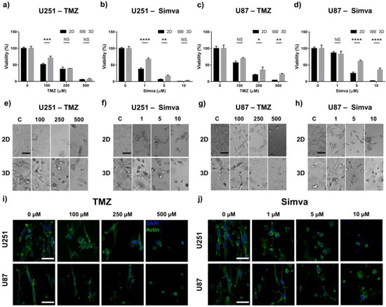 Drug sensitivity of the GoC and 2D culture systems. Viability and morphological analyses of the U251 and U87 cells after 72 h of treatment with different concentrations of temozolomide (TMZ) and Simva in the 2D culture and GoC. (a) Viability of the U251 cells treated with TMZ. (b) Viability of the U251 cells treated with Simva. (c) Viability of the U87 cells treated with TMZ. (d) Viability of the U87 cells treated with Simva, (a–d). Viability was calculated by live staining and normalizing each treatment with its control group. (e) Bright field images of the U251 cells treated with TMZ. (f) Bright field images of the U251 cells treated with Simva. (g) Bright field images of the U87 cells treated with TMZ. (h) Bright field images of the U87 cells treated with Simva. (i) Cytoskeleton of the U251 and U87 cells in the GoC treated with TMZ; actin (green), and DAPI (4′,6-diamidino-2-phenylindole) (blue). (j) Cytoskeleton of the U251 and U87 cells in the GoC treated with Simva; actin (green), and DAPI (blue). Data are expressed as mean ± standard deviation (n = 3). * p < 0.05, ** p < 0.01, *** p < 0.001, **** p < 0.0001. All scale bars are 50 µm.