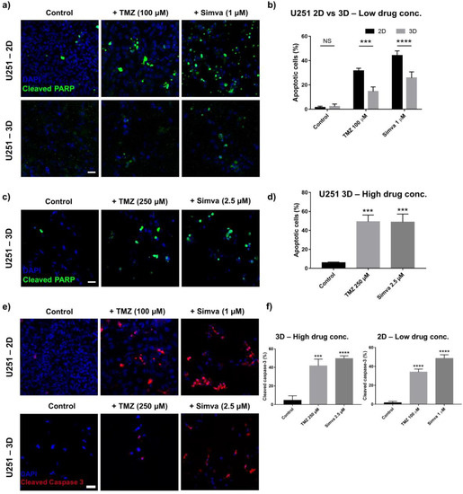 To further confirm the occurrence of drug-induced apoptosis in the GBM cells, the cleavage of caspase-3 in the U251 cells was studied using immunofluorescence staining. Caspase-3 is an executioner of apoptosis and its activation induces the proteolytic cleavage of multiple proteins including PARP [49]. The cleavage of the caspase-3 occurs in the stage prior to the PARP, and therefore we immunostained the U251 cells with cleaved caspase-3 after 60 h of treatment (12 h shorter than the incubation time for cleaved PARP). The immunofluorescence images and the cleavage level of this marker in the U251 cells are shown in Figure 4e,f, respectively. Positive cleaved caspase-3 can be observed in the cells treated with the drugs in both configurations, confirming the activation of the apoptosis pathway due to the treatment with TMZ and Simva.