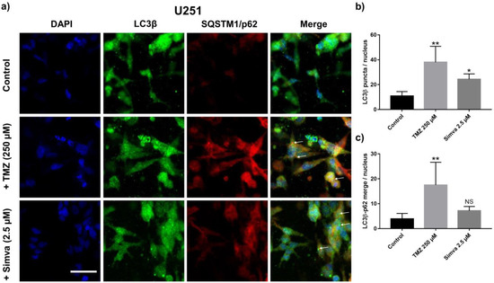 Autophagy is a cellular response to stress in which damaged organelles and the misfolded proteins of cells are collected in autophagosomes and subsequently delivered to the lysosome for degradation [10]. Depending on the level of cellular stress, autophagy could lead to cell survival or, in severe situations, it will lead to cell death [10]. Autophagy can be triggered by several mechanisms, such as starvation, hypoxia, and chemotherapy [50]. Here, the changes in the autophagy pathway in GBM cells due to the treatment with TMZ and Simva were studied in the GoC model. We stained the U251 cells with LC3β and p62, two main markers of autophagosome formation and autophagy flux, after 72 h of treatment with TMZ (250 µM) and Simva (2.5 µM). The immunofluorescence images for the U251 cells are shown in Figure 5a, in which DAPI (blue), LC3β (green), p62 (red), and merged images are shown in different panels. For the samples treated with TMZ and Simva, there was an increase in the formation of LC3β puncta, which is a marker for the formation of autophagosomes, while such a high number of LC3 puncta was not observed in the control group. The LC3β punctuation (pointed with arrows in Figure 5a) was quantified by counting the average number of LC3β puncta per nucleus (Figure 5b). The graph shows that the treatments significantly increased the number of LC3β puncta compared to the control group (p < 0.01 for TMZ and p < 0.05 for Simva). Besides the formation of LC3β puncta, their co-localization with p62 is an indicator of autophagy flux (delivery of autophagosome to lysosomes), which is pointed out by arrows in the TMZ treatment [10]. The number of LC3 puncta co-localized with p62 was quantified for the control and treatment groups, which is shown in Figure 5c. The co-localization in TMZ group was significantly higher than in the control group (p < 0.01), while the difference between the Simva and control was not significant. This shows that the TMZ induced autophagy flux in the cells, while Simva did not show such a level of co-localization, revealing that Simva inhibited autophagy flux in the U251 cells even though it induced an increase in LC3 puncta.