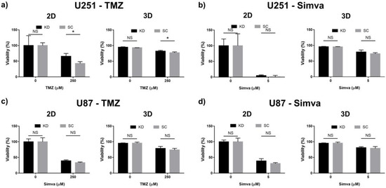 It is well known that autophagy can either support or inhibit apoptosis in a cellular system [51,52]. Atg7 is one of the key regulators of autophagy which is upstream to autophagosome formation [53,54]. Therefore, the knockdown of Atg7 affects the entire autophagy process and is a key parameter to investigate the autophagy pathway. To investigate how autophagy was involved in the regulation of TMZ- and Simva-induced cell death, the viability of the Atg7 knockdown (KD) and their scrambled (SC) counterparts were evaluated when the cells were treated with TMZ and Simva. In brief, the U87 and U251 cells were treated with TMZ (250 µM) and Simva (5 µM) and their viability was compared to that of the untreated cells (control). Our results (Figure 6) suggest that Atg7 KD did not affect the Simva-induced cell death, whereas for TMZ the viability of the KD and SC cells was only different for the U251 cells. This observation confirmed that the Atg7-dependent autophagy pathway is not involved in Simva-induced cell death in both U87 and U251 cells, while TMZ-induced cell death is Atg7-dependent in U251 cells.