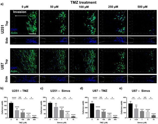 Effect of the drug treatment on tumor invasion in the GoC. (a) Z-stacked DAPI/actin immunofluorescence images of the U251 and U87 cells invading to the side compartment under treatment with different concentrations of temozolomide (0–500 µM). Number of invaded cells per mm width of the chip for the U251 and U87 cells treated with TMZ (0–500 µM) and Simva (0–10 µM): (b) U251 cells, TMZ; (c) U251 cells, Simva; (d) U87 cells, TMZ; and (e) U87 cells, Simva. Data are expressed as mean ± standard deviation (n = 3). * p < 0.05, ** p < 0.01, *** p < 0.001, **** p < 0.0001. Scale bar is 200 µm.