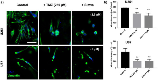 It was shown that TMZ and Simva decreased the invasion of the U251 and U87 cells in the GoC model. To further confirm the effect of these drugs on the invasiveness of the cells, the expression of vimentin, a marker indicative of cellular phenotype and invasiveness, in the U251 and U87 cells was studied after 72 h of treatment with the TMZ (250 µM) and Simva (2.5 µM for U251 and 5 µM for U87). Figure 8a illustrates the immunofluorescence images of the cells stained with vimentin. The expression level of vimentin was quantified by measuring the average area of vimentin per nucleus (Figure S4), and the results are shown in Figure 8b. The graphs show that the level of vimentin in the control condition was significantly higher than in the treated condition (p < 0.01). This shows that the cells in the control condition showed a more mesenchyme-like behavior, compared to the cells treated with TMZ and Simva, which expressed more epithelial-like behavior, suggesting that treatment with TMZ and Simva reduces the invasiveness of the cells. Such a suppression in invasiveness, along with the reduction in the number of viable cells in the treated cells, reduced the number of invaded cells (Figure 7), suggesting invasion as a sensitive parameter for the analysis of the effects of chemotherapy treatments on GBM.