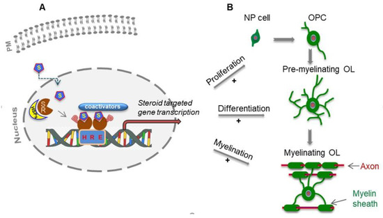 As numerous experimental animal studies have demonstrated an important role of progesterone and testosterone, among other steroid hormones, in the processes of myelination and remyelination (Figure 1B), we focus this review on updated data from our group and others that begin to identify and characterize the roles of these two steroids and their respective NR signaling in myelin development and repair. In particular, recent findings from our laboratory indicate that progesterone and testosterone not only regulate proliferation and differentiation of myelinating cells (Figure 1B), two key events in MS disease, but may also modulate the vulnerability of the myelin sheaths and neurons to toxic insults.