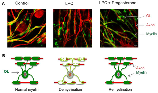 Even if the cellular mechanisms responsible for the therapeutic effects of progesterone on remyelination are not fully understood, progesterone may participate in remyelination by either stimulating the proliferation and maturation of OPCs, or indirectly by modulating autoimmune and inflammatory processes.