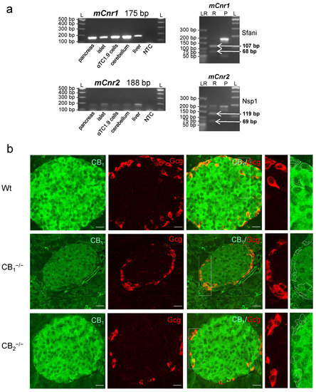(a) Expression of cannabinoid receptor type 1 (Cnr1) and 2 (Cnr2) mRNA in mouse (m) tissues. RT-PCR followed by gel electrophoresis (left column) revealed the expression of mCnr1 and mCnr2 transcripts in different mouse organs, particularly, in pancreatic tissue including the islets of Langerhans and the mouse alpha-cell line αTC1.9. Restriction digestion of the 175 bp mCnr1 amplicon resulted in defined fragments with molecular sizes of 107 and 68 bp (right column). The restriction analysis of the 188 bp mCnr2 showed defined fragments with molecular sizes of 119 and 69 bp (right column). NTC: nontemplate control; L: 100 bp ladder; LR: low-molecular-range ladder; P: Cnr1 or Cnr2 amplification product; R: restriction fragments. (b) Immunohistochemical staining of cannabinoid receptor type 1 (CB1) in the pancreatic tissue of wild-type (Wt) mice displayed specific labelling of an islet. Glucagon (Gcg, red) and CB1 (green) double-immunolabelling demonstrated the presence of CB1, not only in beta-cells, but also in alpha-cells. At higher magnifications of alpha-cells (2 fold, right panels), weaker CB1 staining was evident. No immunohistochemical staining of CB1 was detected in pancreatic islets of CB1−/− knockout mice. In all cases, confocal optical sections were merged and are representative for pancreatic islets of the whole pancreatic tissue from three mice per group. Scale bar 20 µm.
