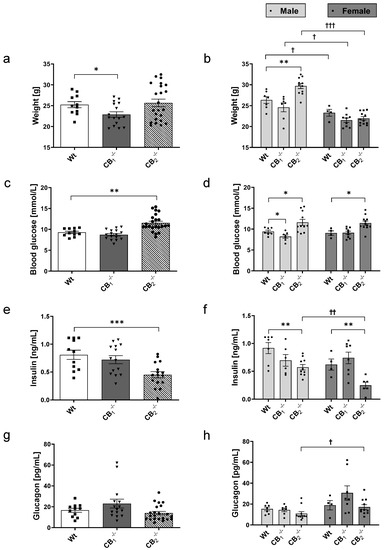 The CB2−/− mice showed decreased plasma insulin levels combined with increased blood glucose levels in both sexes, and increased body weights in male mice. Another study reported in two-month-old male CB2−/− mice similar body weight values to those of normoglycaemic, age-matched, wild-type mice [18]. Increased body weight of CB2−/− mice was measured in other studies [19,35], which is in accordance with our data considering male CB2−/− mice only.