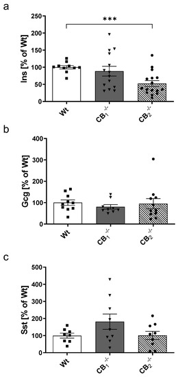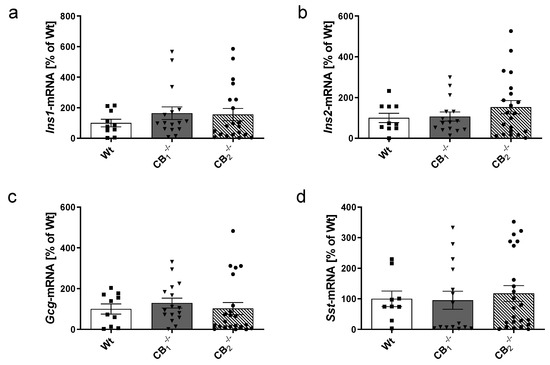 The previous observations regarding the shift of metabolic parameters in cannabinoid receptor knockout mice (Figure 2) led us to investigate the effects of cannabinoid receptor knockout on the function of pancreatic islets. To this end, we determined the transcript levels of the pancreatic islet hormones insulin (Ins1 and Ins2), glucagon (Gcg) and somatostatin (Sst) in pancreatic tissue (Figure 3). The specificity of PCR products of pancreatic hormones was confirmed in an earlier study [25]. When comparing islet hormone transcript levels between Wt and knockout mice, no statistically significant differences were observed (Figure 3a–d). In addition, there were no significant variations considering sex-specific analyses (Figure A1a–d).