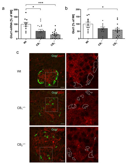Analysis of glucose transporter 1 mRNA levels (Glut1) and protein (Glut1) in pancreatic tissue of male and female wild-type (Wt) mice and cannabinoid receptor knockout mouse lines (CB1−/−, CB2−/−). (a) Relative mRNA expression level of Glut1 was decreased in both knockout mouse lines (n = 10–20). (b) In addition, protein content of Glut1 was also decreased in CB1−/− and CB2−/− mice (n = 10–14). (c) Immunohistochemical staining of Glut1 (red) and colabelling of glucagon (Gcg, green) confirmed the localisation of Glut1 in both alpha- and beta-cells. A magnification of each islet (2.5 fold, box) is shown on the right column, and revealed the reduction of Glut1 in knockout mouse lines. In all cases, confocal optical sections were merged and are representative for pancreatic islets analysed in the whole pancreatic tissue from three mice per group. Values are presented as mean (±S.E.M.) and Wt values were defined as 100%. * p < 0.05; *** p < 0.001; unpaired t-test. Scale bar 20 µm.