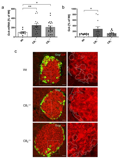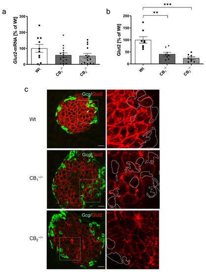 Cannabinoid receptors are GPCRs that have gained increased attention over recent years. Among them, cannabinoid receptors CB1 and CB2 were first described [3,4]. Cannabinoid receptors are part of the endocannabinoid system (ECS), and emerging evidence suggests an important role of these receptors in the pathogenesis of type 2 diabetes mellitus and its chronic complications [5]. In this context, CB1 and CB2 have been clearly identified in rodent and human pancreatic islets [6,7,8], as well as in diverse rodent beta-cell lines [9]. Until now, there has neither been a consensus about the distribution of these receptors in islet cell types within one species, nor between different species [10]. Measurements of downstream signalling upon cannabinoid receptor activation in the pancreatic islets with endogenous or pharmacological cannabinoids have led to conflicting results [7,10,11]. A reliable tool for the investigation of cannabinoid receptor functions in pancreatic islets became available after the development of single cannabinoid receptor knockout mouse lines: CB1-deficient mice [12,13] and CB2-knockout mice [14]. Previous observations on CB1−/− mice revealed an absence of insulin resistance normally occurring in high fat diet-fed mice [15]. Mice deficient in CB1 displayed no changes in glucose tolerance and insulin sensitivity in association with diet-induced obesity [16]. Furthermore, in CB2−/− mice, high fat diet-induced insulin resistance was reduced [17] and a lack of CB2-mediated responses also protected mice from both age-related and diet-induced insulin resistance [18]. Another study on diet-induced obesity in CB2-knockout and CB1/2 double-knockout mice reported that mice lacking both of the cannabinoid receptors were lean and resistant to diet-induced obesity. This phenotype was distinct from CB2-deficient mice which displayed signs of impaired glucose clearance [19]. Notably, in global models lacking cannabinoid receptors, other organs than pancreatic islets such as liver, skeletal muscle or adipose tissue might be directly or indirectly involved in the regulation of blood glucose levels or insulin resistance. In this context, many peripheral tissues are being influenced by the ECS controlling whole-body metabolism as shown in tissue-specific, genetically modified mice [20]. Still, only one study directly analysed the impact of CB1 receptor knockout on pancreatic islet function including insulin, glucokinase and glucose transporter 2 [21]. However, components of the glucose sensing machinery such as glucokinase and glucose transporters are essential for islet cell function [22,23]. Notably, glucose transporter 2 (Glut2) is required for glucose stimulated insulin secretion in rodent islets, while GLUT1 plays a major role in human beta-cells [23].