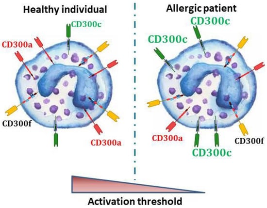 In human basophils, IgE-dependent activation is regulated, among others, by CD300 activating and inhibitory receptors. In allergic individuals, a lower expression of the CD300a inhibitory receptor [] and a higher expression of CD300c activating receptor [,] have been described. Therefore, it could be postulated that in allergic people, the unbalance in the CD300 mediated signals may lead to a lower FcεRI activation threshold.