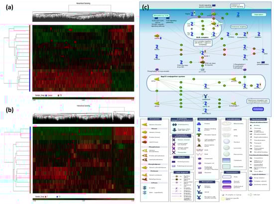 The top-ranking pathways enriched in comparison I included autophagy (Figure 1c), bile acids regulation of glucose/lipid metabolism via farnesoid X receptor (FXR), and cell adhesion of ephrin signaling (Table S2). The top-ranking pathways enriched in comparison II included activation of PKC via G-protein coupled receptors, NF-AT signaling, and ACM regulation of nerve impulse (Table S3).