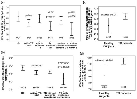 Differential DNA methylation levels over the PARP9, miR-505, RASGRP4, and GNG12 genes in the validation cohort. (a) PARP9 (+1741 CpG site) gene was hypomethylated in TB patients and further hypomethylated in those with far advanced lesions on CXR or without sputum smear/culture conversion to negative after 2-month anti-TB treatment. (b) miR-505 (−690 CpG site) gene was hypomethylated in TB patients, and further hypomethylated in those with systemic symptoms. (c) RASGRP4 (−1194 CpG site) and (d) GNG12 (+1434 CpG site) genes were both hypermethylated in TB patients versus HS. *compared with HS and adjusted by multivariate linear regression analysis. #compared with TB patients without specific clinical phenotype and adjusted by multivariate linear regression analysis.