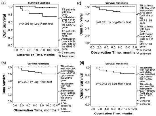 Differential DNA methylation levels of the WIPI2, MRPS18B, FOXO3, and GNG12 genes in association with long-term outcomes of the active TB patients in the validation cohort. (a) TB patients with high DNA methylation levels over the GNG12 (+1434 CpG site) gene had lower 1-year survival. Lower one-year survival rate was also noted in TB patients with (b) high DNA methylation levels over the WIPI2 (+28532 CpG site) gene, (c) low DNA methylation levels over the MRPS18B (+982 CpG site) gene, or (d) low DNA methylation levels over the FOXO3 (+106809 CpG site) gene.