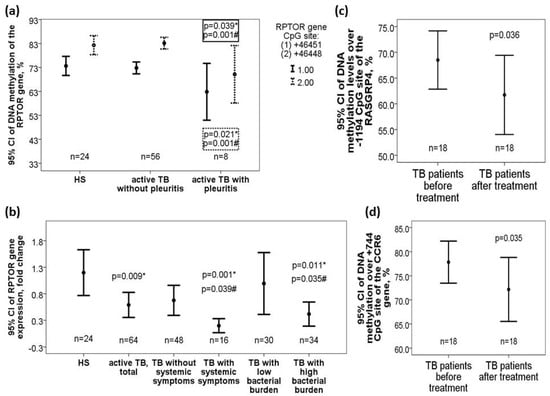 Differential DNA methylation levels of the RPTOR, CCR6, and RASGRP4 genes along with corresponding RATOR gene expression changes in the validation cohort. (a) RPTOR gene (+46451/+46468) was hypomethylated in active pulmonary TB patients with pleurisy versus those without pleurisy or HS. (b) RPTOR gene expression was decreased in TB patients and further decreased in those with high bacterial burden or systemic symptoms versus those without the phenotype or HS. DNA methylation levels over the (c) RASGRP4 (−1194 CpG site) genes and (d) CCR6 (+744 CpG site) were both decreased after 6-month anti-TB treatment. *Compared with HS and adjusted by multivariate linear regression analysis. #Compared with TB patients without specific clinical phenotype and adjusted by multivariate linear regression analysis