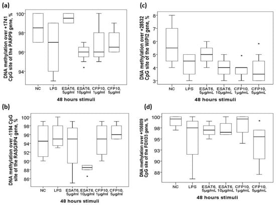 To determine whether Mtb-specific antigen per se can affect DNA methylation levels or corresponding gene expressions of the candidate genes, human monocytic THP-1 cells were exposed in vitro to either ESAT6, CFP10, LPS, or medium for 48 h. DNA methylation levels over +1741 CpG site of the PARP9 gene and −1194 CpG site of the RASGRP4 gene were both decreased in response to ESAT6 treatment (both p values <0.05, Figure 5a,b). DNA methylation levels over +28532 CpG site of the WIPI2 gene and +106809 CpG site of the FOXO3 gene were both decreased in response to CFP10 treatment (both p values <0.05, Figure 5c,d). DNA methylation levels of the other 5 candidate genes all showed no significant changes. Gene expressions of the 9 candidate genes were all up regulated with either ESAT6 or CFP10 stimuli except for the miR-505 gene, which showed down-regulation (Figure S1).
