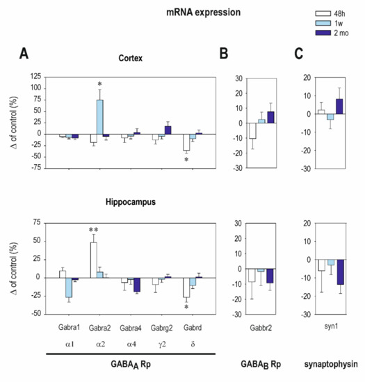 | Gabra1 (α1) | 16.3 ± 0.7 | 15.3 ± 0.6 | 24.2 ± 1.7 | 22.7 ± 0.9 | 27.3 ± 2.4 | 26.6 ± 1.6 |
