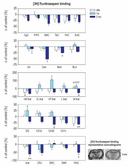 - Tietz, E.I.; Rosenberg, H.C.; Chiu, T.H. Autoradiographic localization of benzodiazepine receptor downregulation. J. Pharmacol. Exp. Ther. 1986, 236, 284–292. [Google Scholar]