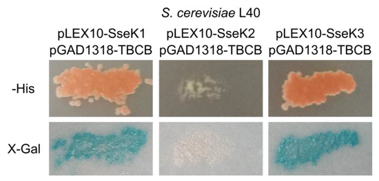 The initial hypothesis of this work was that, after translocation through a T3SS, SseK1 would interact with host proteins that could also be substrates for the arginine glycosyltransferase activity of this Salmonella effector. In order to identify putative host interacting partners, SseK1 from the S. enterica serovar Typhimurium strain 14028 was fused to the DNA-binding domain of the bacterial LexA transcriptional factor using plasmid pLEX10 as a vector to yield plasmid pIZ2203. A yeast two-hybrid screen was carried out by transforming the Saccharomyces cerevisiae strain L40/pIZ2203 with a Jurkat (human lymphocyte cell line) cDNA library fused to the activation domain of the yeast transcriptional factor Gal4 using the vector pGAD1318. A total of 878 clones out of 7 × 105 transformants were able to grow in synthetic medium lacking histidine, that was used to select for the interactions. The expression of a second reporter gene, lacZ, was also tested, and 180 clones demonstrated β-galactosidase activity (blue color in the presence of X-Gal). Plasmid derivatives of pGAD1318 were isolated from these positive clones, and a subset of them was reintroduced in yeasts L40/pIZ2203 and L40/pLEX10 and tested for reporter gene activation. Sequencing of the specific clones revealed that most of them carried cDNA from human TBCB. The interaction of SseK1 with TBCB in the yeast two-hybrid system is shown in Figure 1.