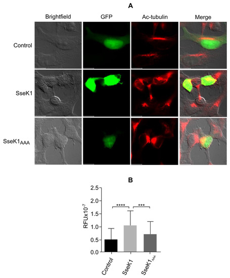 TBCB, together with TBCE, plays a role in microtubule biosynthesis [17], and overexpression of these cofactors leads to microtubule depolymerization [18]. The results presented above indicate that TBCB may interact with and be modified by SseK1, opening the possibility that this Salmonella effector may have an impact on microtubule dynamics. To test this hypothesis, we transfected HEK293T cells with plasmids expressing GFP-SseK1 or GFP alone, and we measured the acetylation level of α-tubulin by fluorescence microscopy since acetylation of α-tubulin correlates with microtubule stability [19,20,21]. The expression of SseK1 significantly increased the level of acetylated microtubules (Figure 7). Importantly, this effect was significantly reduced when cells were transfected with a plasmid expressing GFP-SseK1AAA, the catalytic mutant of this effector, suggesting that its GlcNAc transferase activity was involved in the alteration of the microtubule dynamics of the host cell.