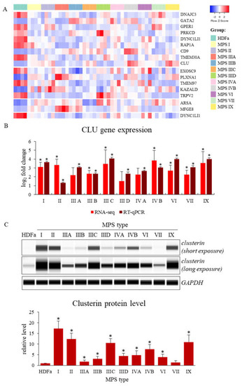 Ten of these genes were down-expressed in MPS cells relative to healthy cells. They include genes of receptors, TRPV2 (transient receptor potential cation channel subfamily V member 2; TRPV2 gene product) and estrogen receptor (the GPER1 gene product), cellular kinases like tyrosine-protein kinase PRKCD (the PRKCD gene product) or components of cytoplasmic dynein complex, dynein cytoplasmic 1 light intermediate chain 1 (the DYNC1LI1 gene product). However, some of the functionally important protein-encoding genes are up-regulated in cells taken from MPS patients. They include: plexin A1 (product of the PLXNA1 gene), milk fat globule-EGF factor 8 protein, MFGE8 (product of the MFGE8 gene), arylsulfatase A (products of the ARSA gene) or transcriptional factor GATA binding protein 2 (product of the GATA2 gene). A particularly interesting gene undergoing increased expression in MPS is the CLU gene, encoding the clusterin protein (one of molecular chaperones). The results demonstrating altered CLU gene expression, obtained using the RNA-seq technique, were confirmed independently by RT-qPCR (Figure 1B). Moreover, increased levels of clusterin, the CLU gene product, in MPS cells were confirmed by Western-blotting (Figure 1C).