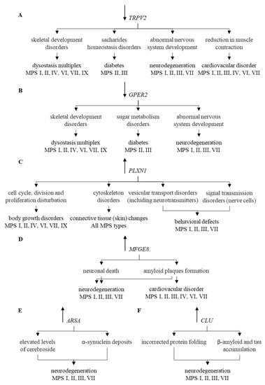 Correlation of changes in the expression of individual genes (TRPV2 (A), GPER2 (B), PLXN1 (C), MFGE8 (D), ARSA (E), and CLU (F)) and their functions with symptoms occurring in particular types of MPS. Symbols ↑ and ↓ near gene names indicate elevated and decreased levels of corresponding transcripts in MPS vs. control cells, respectively.