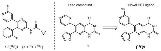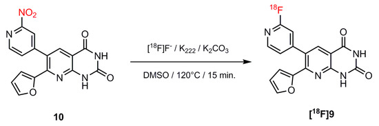 Therefore, the aim of the present study was to develop a new radiofluorinated PET tracer possessing (i) a higher selectivity for the adenosine A2B receptor versus the other subtypes, and (ii) a suitable metabolic profile in vivo. For this purpose, we selected the bicyclic pyridopyrimidine-2,4-dione core as the lead structure (2 in Figure 1), which was previously described to fulfill both criteria [16]. The authors reported for 2 a Ki value of 1 nM at the A2B receptor (see Table 1) and a high metabolic stability, determined via in vitro studies with rat hepatic microsomes [16]. In order to introduce the required radiofluoro atom, the pyrimidine ring of 2 was substituted by a 2-fluoropyridine ring representing a very common heteroaromatic motive for 18F-radiolabeling reactions ([18F]9, Figure 1). For a straightforward radiosynthesis using nucleophilic aromatic substitution with [18F]fluoride, a precursor compound was developed containing a nitro group as a suitable leaving group (10, Scheme 1).