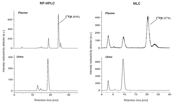 Exemplary RP-HPLC (left) and MLC (right) radio-chromatograms of mouse plasma and urine samples at 30 min p.i. of [18F]9 (conditions RP-HPLC: Reprosil-Pur C18-AQ, 250 × 4.6 mm, gradient with eluent mixture of ACN/20 mM aq. NH4OAc, 1.0 mL/min; conditions MLC: Reprosil-Pur C18-AQ, 250 × 4.6 mm, gradient with an eluent mixture of EtOH/100 mM aq. SDS/25 mM aq. (NH4)2HPO4, 1.0 mL/min).