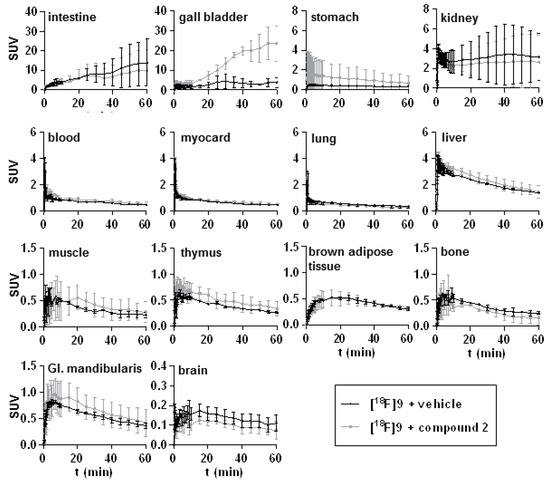 Biodistribution of [18F]9 in female CD-1 mice derived by small-animal PET over 60 min; time–activity curves (TACs) for tissue uptake are expressed as standard uptake values (SUVs), n = 2, mean ± SD.