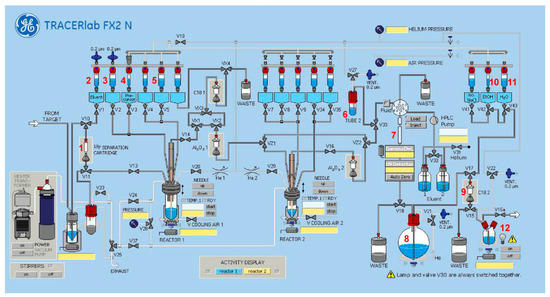Remote-controlled radiosynthesis of [18F]9 was performed using a TRACERlab FX2 N synthesizer (GE Healthcare, Waukesha, WI, USA) equipped with a Laboport vacuum pump N810.3FT.18 (KNF Neuburger GmbH, Freiburg, Germany), a BlueShadow UV detector 10D (KNAUER GmbH, Berlin, Germany), and the TRACERlab FX Software (GE Healthcare, Waukesha, WI, USA).